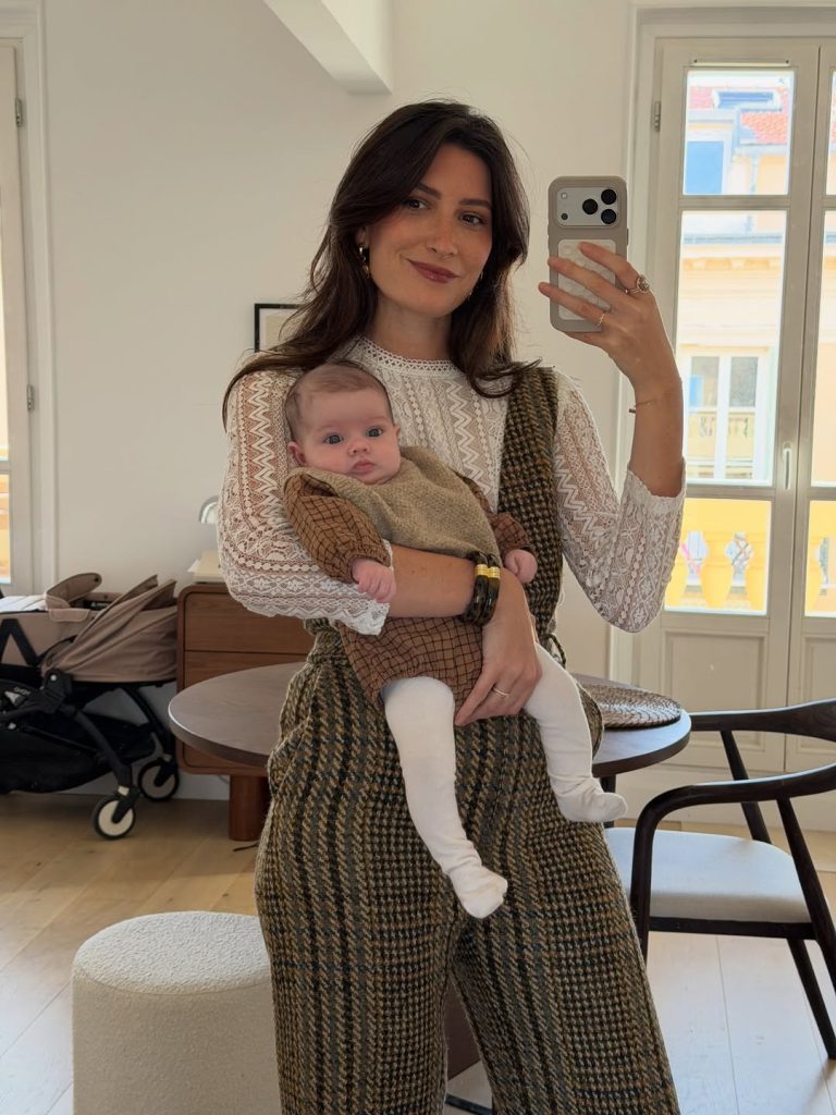 A crisp blouse and relaxed jeans bring downtown polish to everyday motherhood.