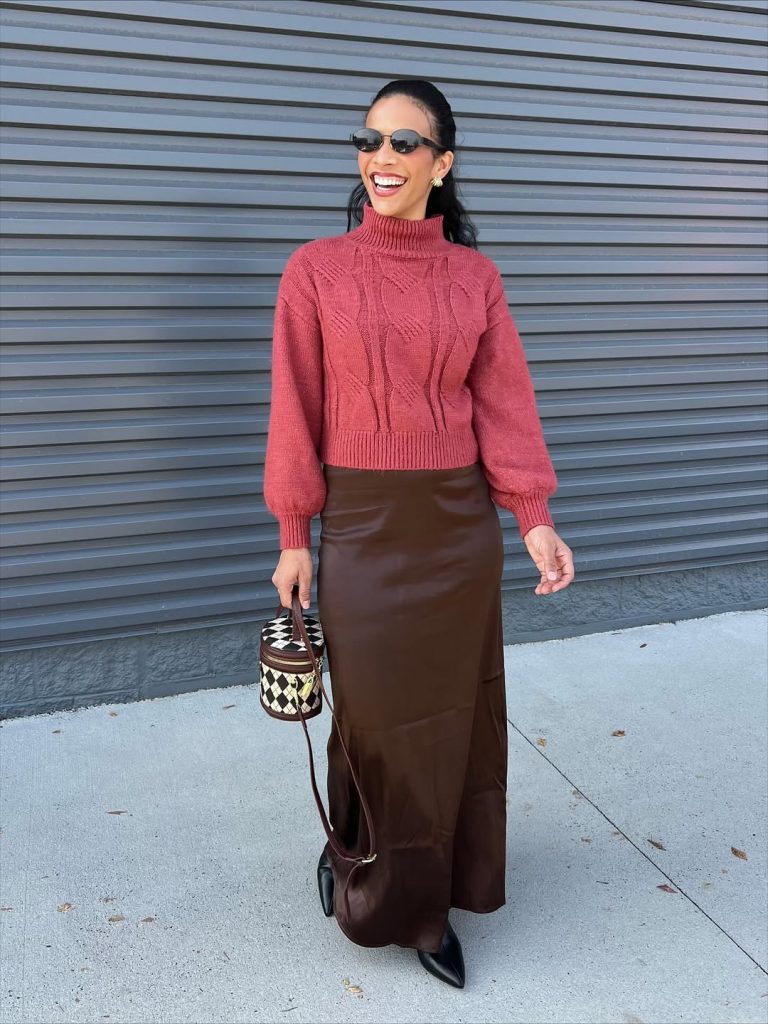 A sculptural sweater paired with a sleek skirt proves that spring mom outfits 2026 can feel both dressy and approachable.