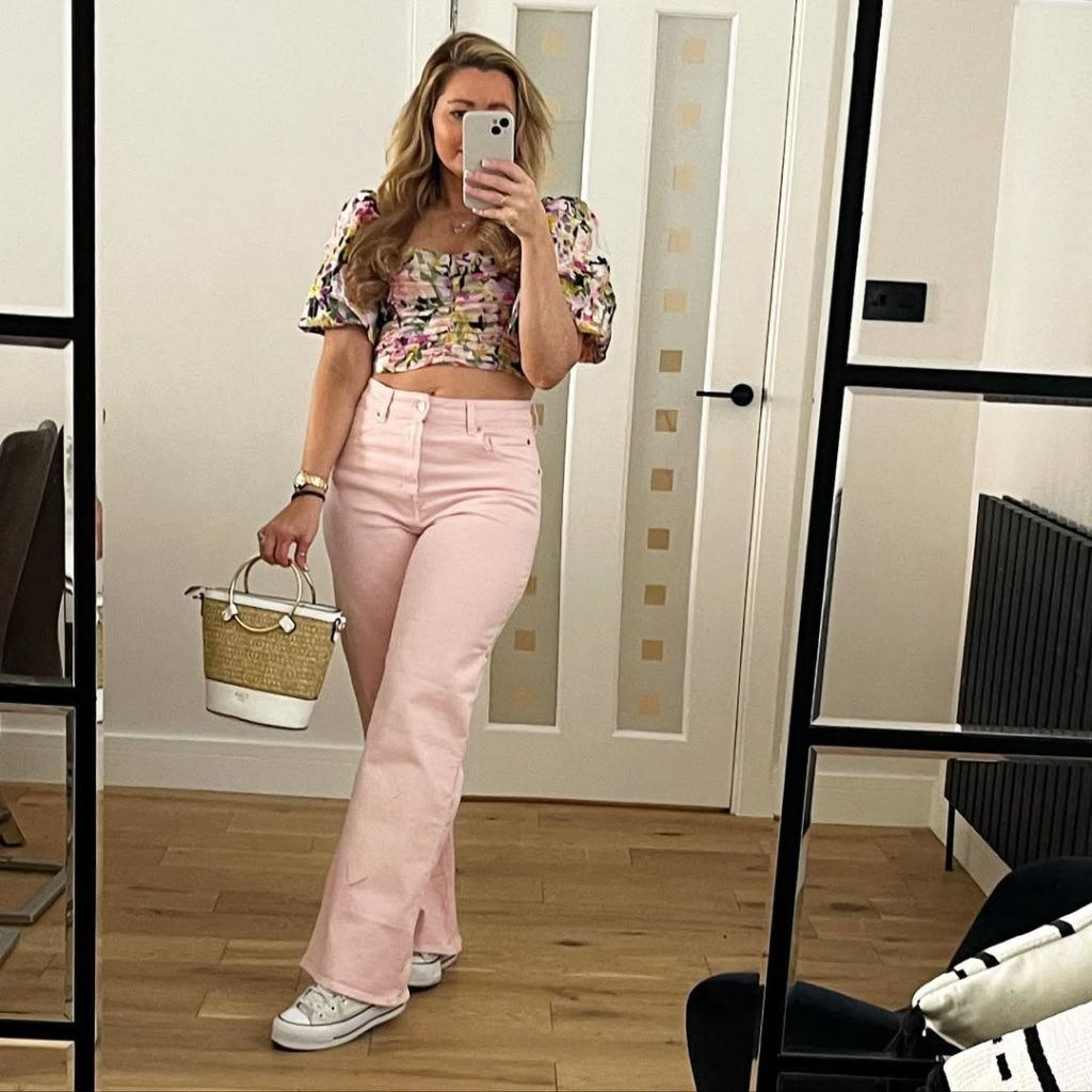 A floral crop top and blush denim strike the sweet spot between youthful and polished—proof that playful still works in your 40s.