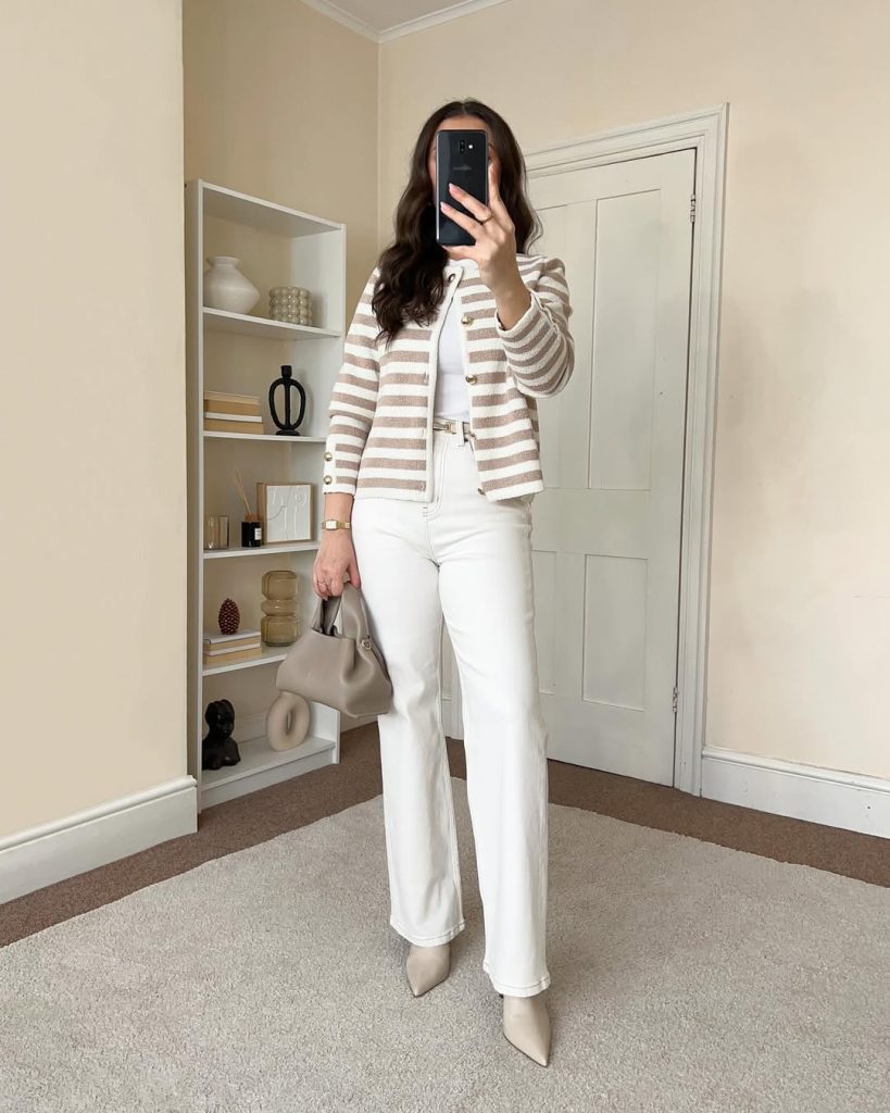 Soft stripes, creamy denim, and taupe accessories create an understated An aesthetic that feels modern and wearable.