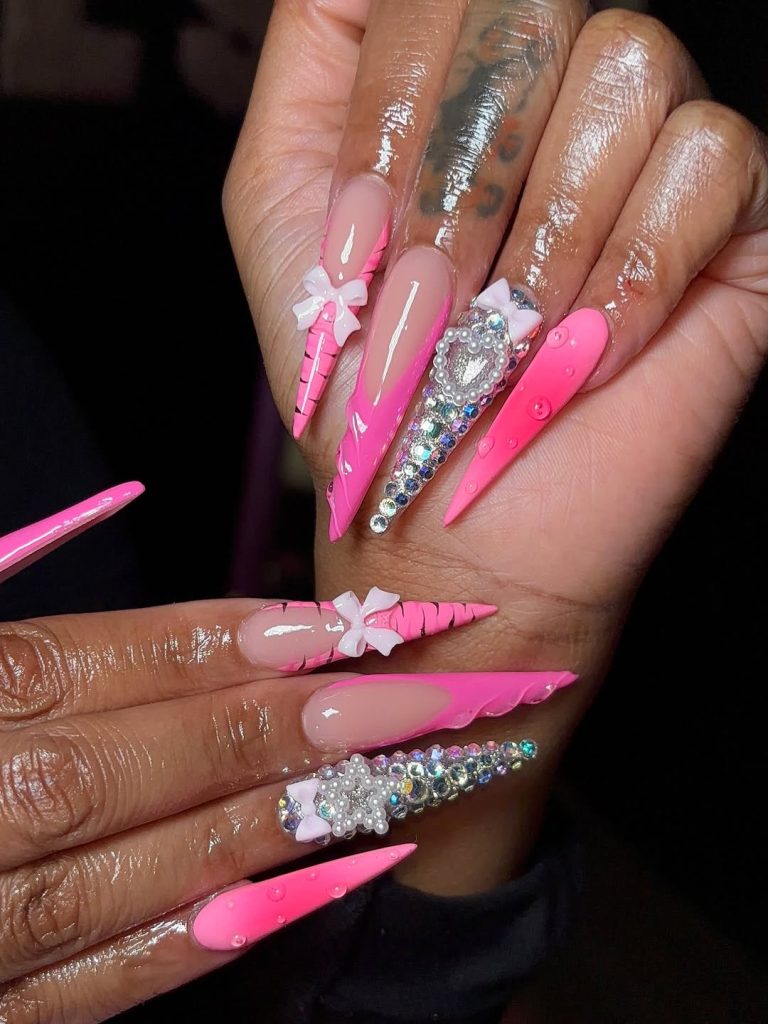 What a playful glam look these stiletto nails represent, with a combination of high-gloss hot pink, diamond-encrusted rhinestones, and adorable 3D bows. It’s as if you’re stepping into a candy store for adults. Long and narrow shapes provide a bold, fearless edge, but it’s the particulars that bring that flirtatious, playful edge that will make it unforgettable.