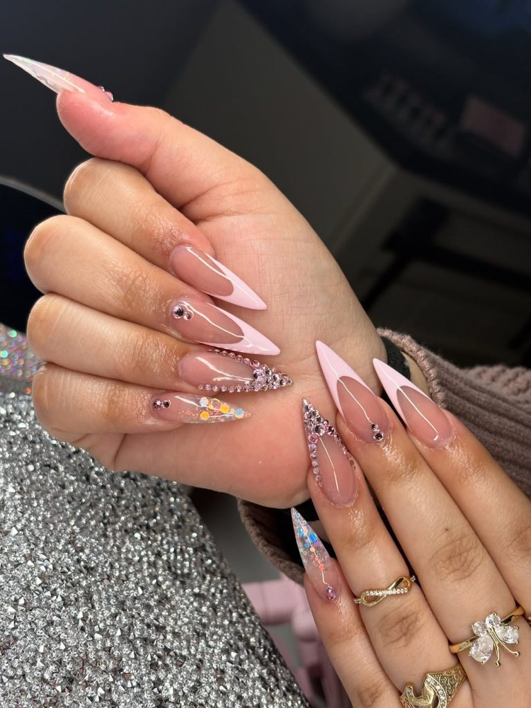 These pink stiletto nails bring French charm into 2026 with a sparkling makeover. Lightweight pink bases are accompanied by crystal embellishments, glitter tips, and delicate borders so that the design feels chic yet trendy. It’s a meeting of old-school charm and modern sparkle that never fails to look sleek.