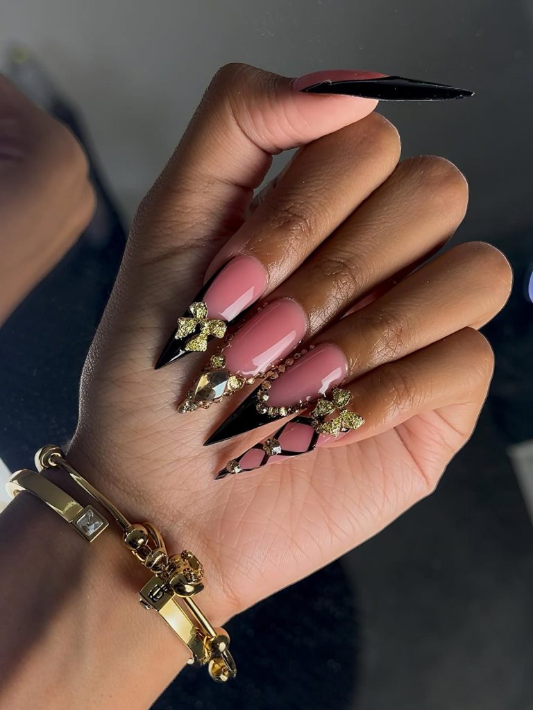 This look exudes pure sophistication with an edge. Black glossy tips with soft pink bases create a bold contrast, while floral elements in gold with glittering stones inject a bit of sophistication. With a delicate balance of boldness and femininity, this nail style resembles wearable art, ideal for that individual who adores that high-impact look.