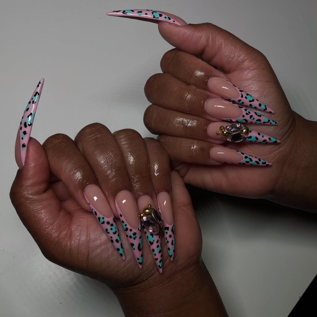 This look suits a person who adores cute yet fearless designs. Ideal for summer attire and everyday wear, such nails could effortlessly transform daywear. With a trendy edge provided by animal print, this look gets a special sparkle from gemstones that will surely turn heads. If you’re after fun, flirty, and innovative nails, this design is a must-have.