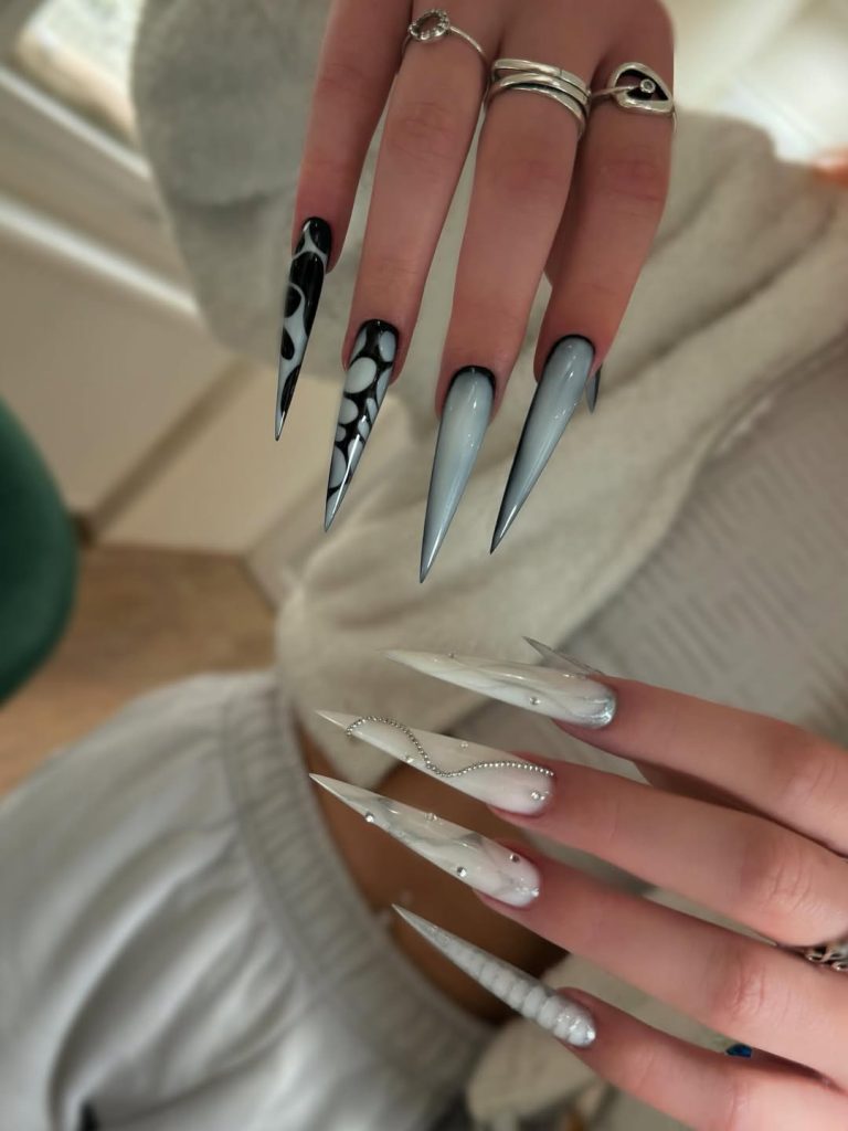 This black, white, and gray stiletto nail set with artistic flair includes alternating designs that work in black, white, and gray with various designs such as ombré fades, abstract spots, and high-gloss sheens. It will look modern and edgy on you. Since every nail varies, it will look high fashion as a whole.