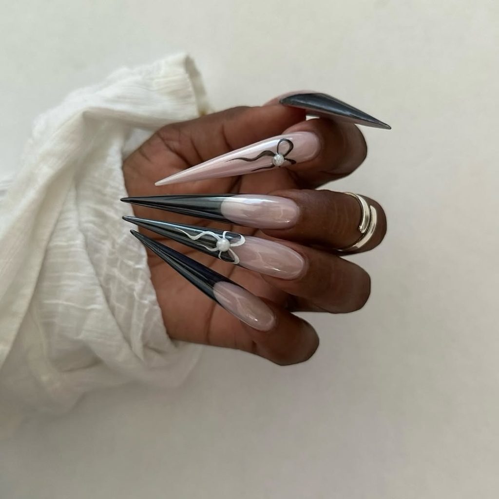 These stiletto nails are a great combination of sassy and adorable. With shiny black and muted nude bases, contrast comes easy—the delicate bow designs with pearls, though, give it a cute, feminine feel. It’s a delicate expression of playful elements that won’t detract from that dramatic silhouette.