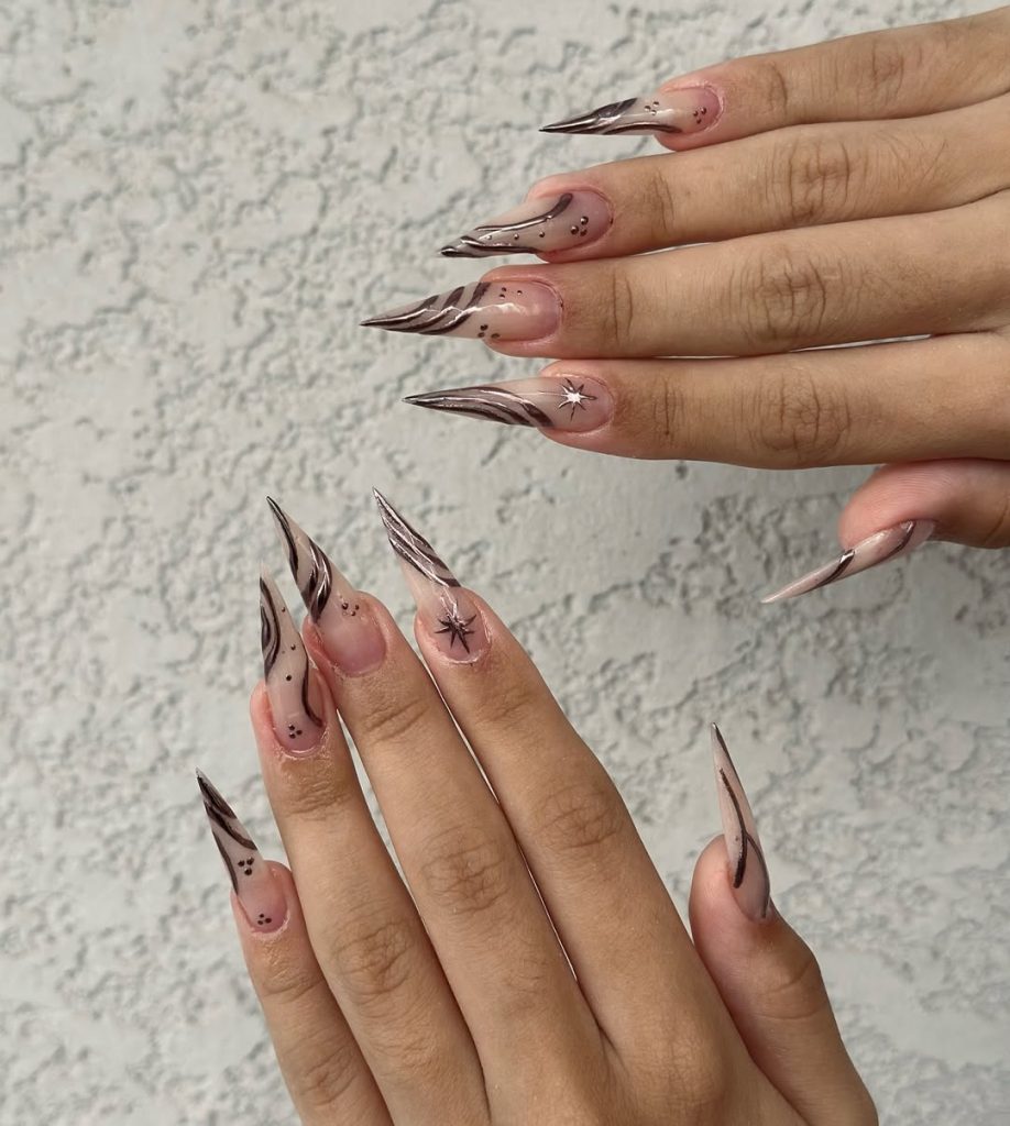 With ethereal swirls of brown that pair with delicate star and dot detailing, they’re a celestial inspiration in nail form. With nude bases matched with swirly tips, they exude an ethereal glow that’s almost as if you’re having galaxies on your fingertips. They’re playful yet refined, best for everyone who needs a dash of magic to that mani.