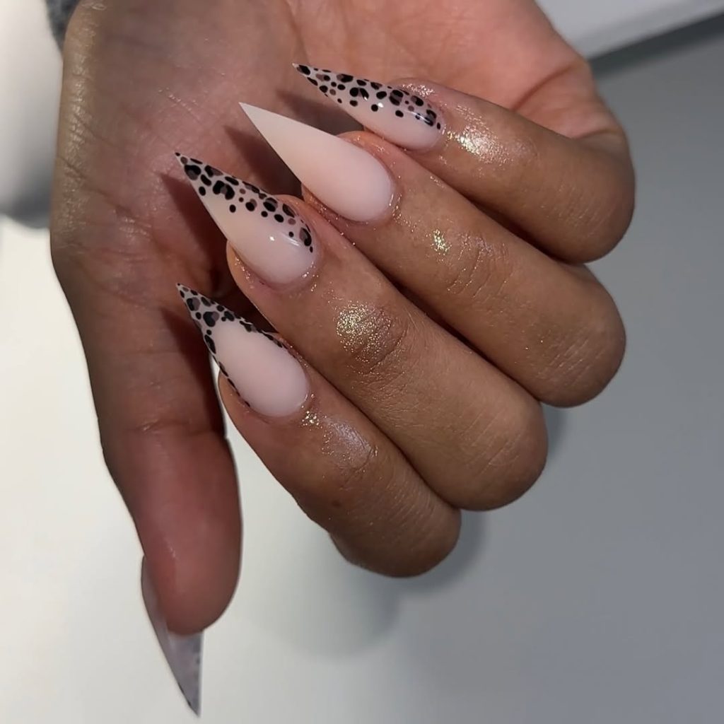 Strong but minimal, these stiletto nails feature a playful Dalmatian print design in matte black on a nude base color. It’s a new, trendy look with lots of contrast between matte black spots and a clean background. It’s minimal in design but strong in nature, so a good option if you want your nail designs to be playful but wearable.