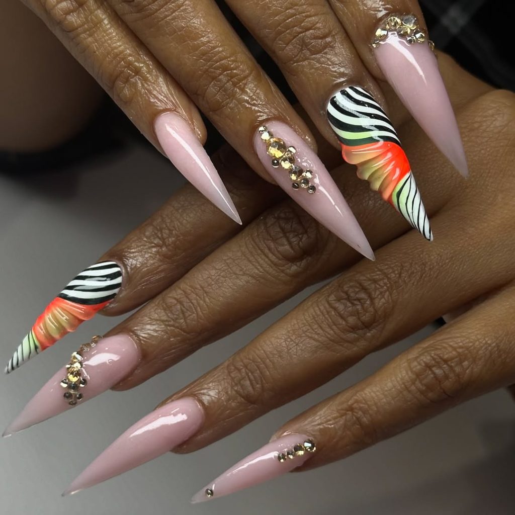 These nails are all about wild energy. The vibrant neon orange, yellow, and green zebra-inspired stripes look fierce against the pale pink base, while rhinestone accents add sparkle and glam. The result? A look that’s playful, daring, and unapologetically bold.