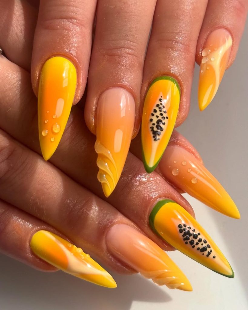 These nails look as fresh as a summer smoothie. With bold shades of orange, yellow, and hints of green, plus tiny black seed details, they mimic the juicy look of tropical fruit. Glossy finishes and water drop effects make them appear even more mouthwatering and full of life.