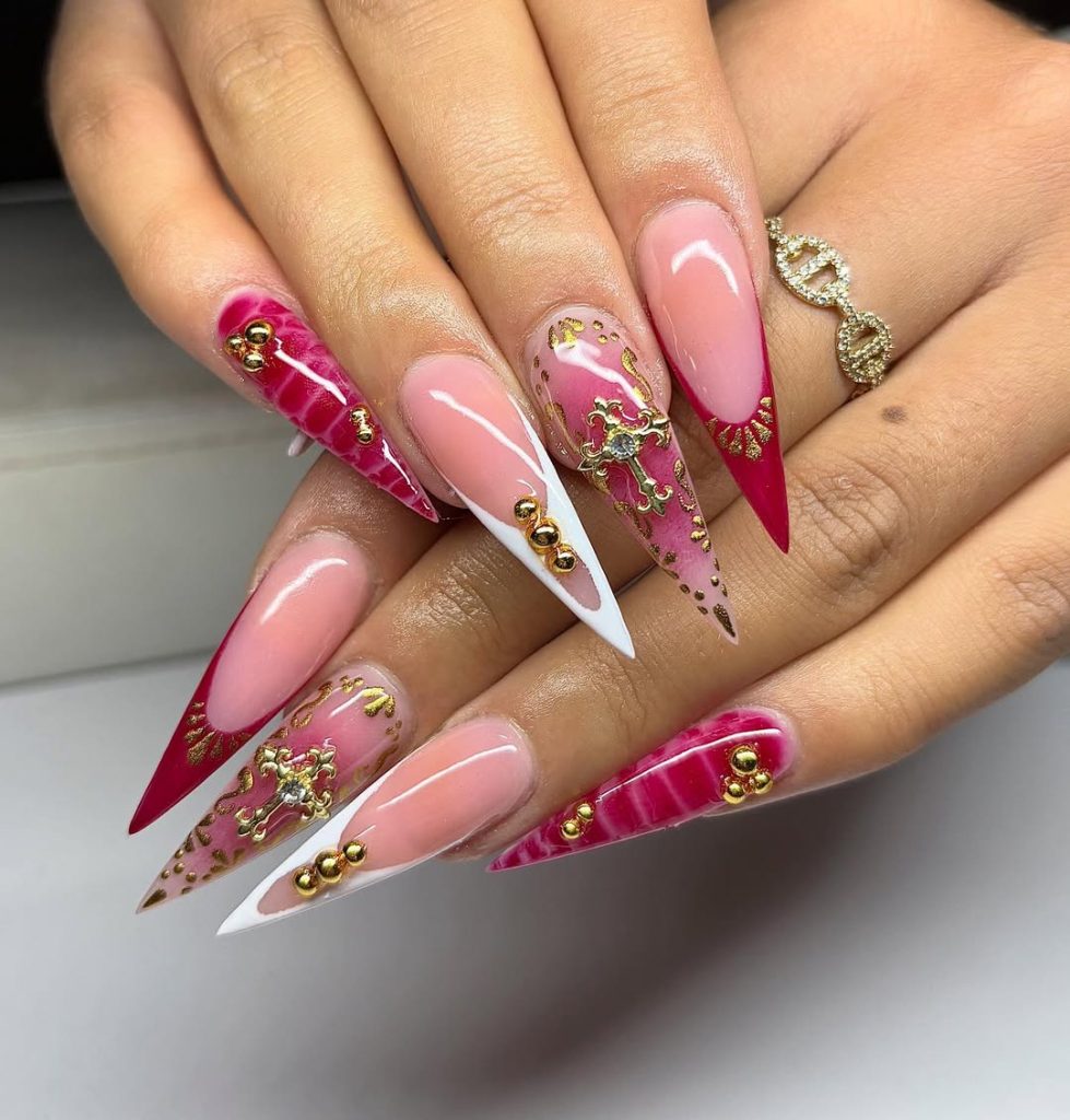 This red and white stiletto manicure is all about regal elegance. The gold embellishments sparkle against deep tones, creating a vibe that’s sophisticated yet daring. The balance of bold colors with delicate detailing makes this look stand out like jewelry for your hands.