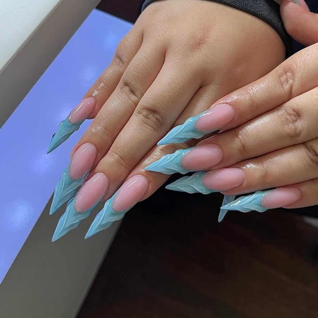 This frosty design is all about icy glam. The pale blue 3D sculpted tips look like frozen shards of ice, perfectly paired with a glossy nude base. The overall effect is bold, striking, and a little magical—like winter wonderland vibes captured in a manicure.