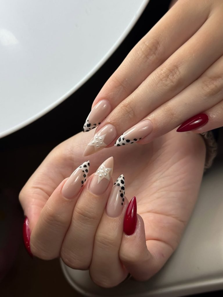This stylish set pairs fun dalmatian print tips with red stiletto nails for a high-fashion contrast. The nude base keeps it simple, but pearl star embellishments bring just a pinch of charm. It’s a combination of edgy and classy, that stylish pop without being overkill.