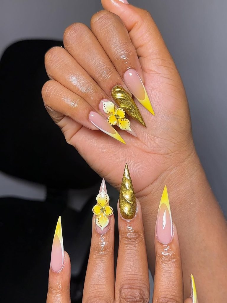 Whimsical yet high-end, these nails feature bright yellow French tips with 3D butterfly decorations as well as glittering gold shimmer. Metallic gold polish gives that set a luminous look, while butterflies create an adorable, feminine effect. It’s such a manicure that will instantly cheer you up.