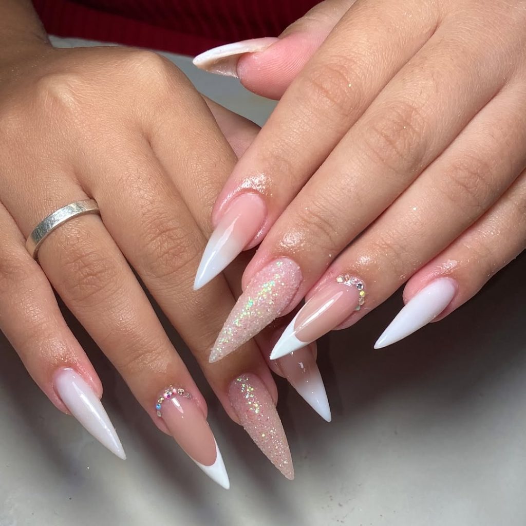 White stiletto nails with glitter accents and rhinestones are the height of delicate sophistication. With French tips, glitter details, and a sprinkle of rhinestones, they exactly strike that middle note between subtle and ostentatious. They sparkle just enough to be festive yet maintain a classic, stylish air.