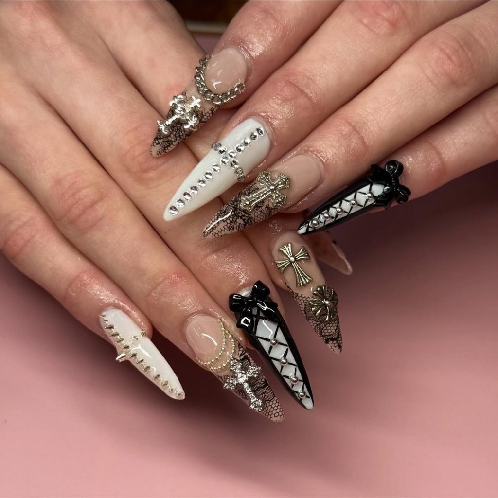 This design is bold, edgy, and brimming with gothic inspiration. With crosses, lace patterns, chains, and 3D bows, each nail is a tiny work of art. The mix of black, white, and metallic accents creates a dramatic effect that feels high-fashion and theatrical.