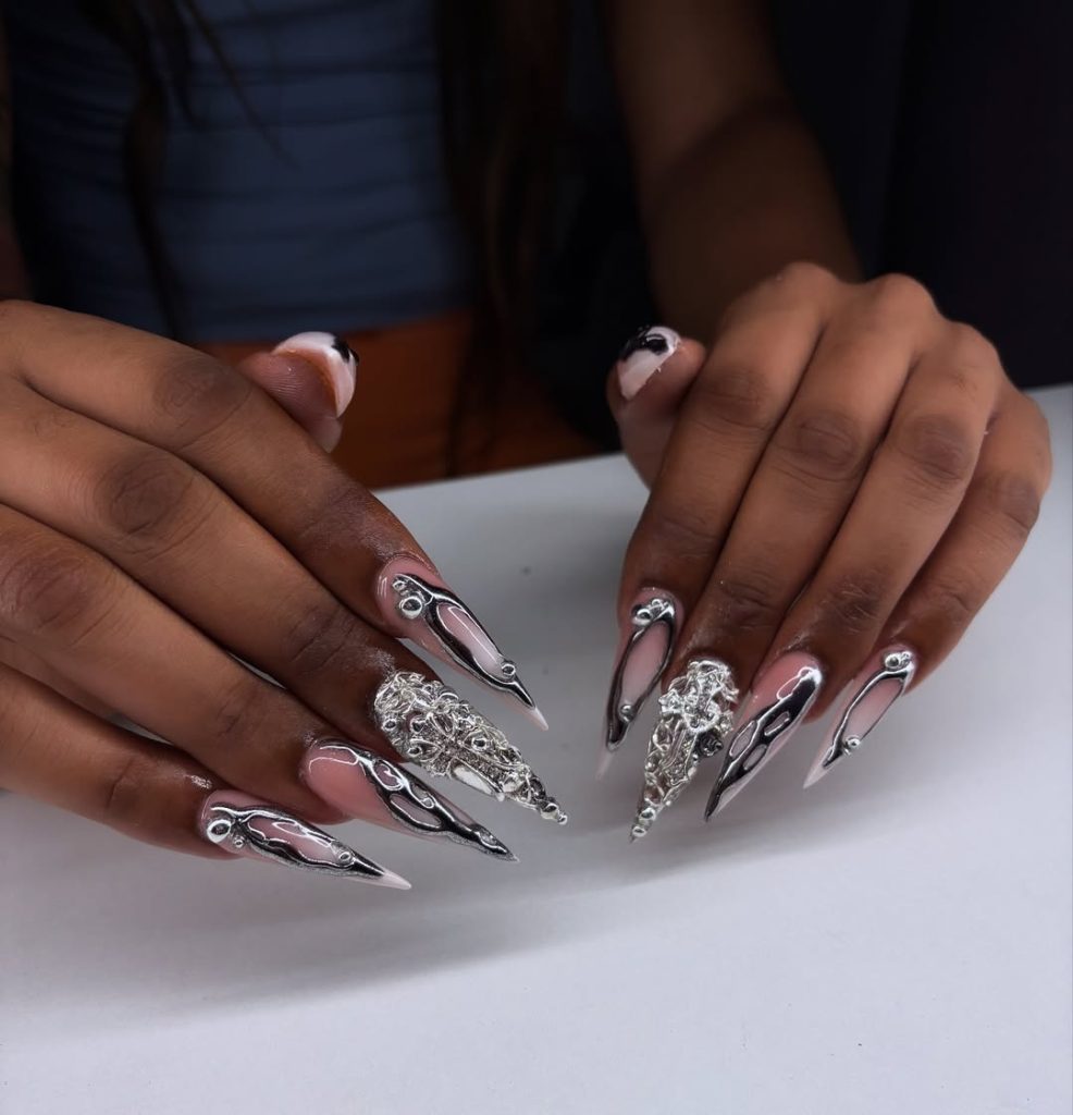 Perfect for anyone who loves unique glam with a touch of edge, this look complements long nails and strong nail beds. Style them with a minimalist ring set to let the silver shine. They’re not just nails—they’re accessories for your confidence.