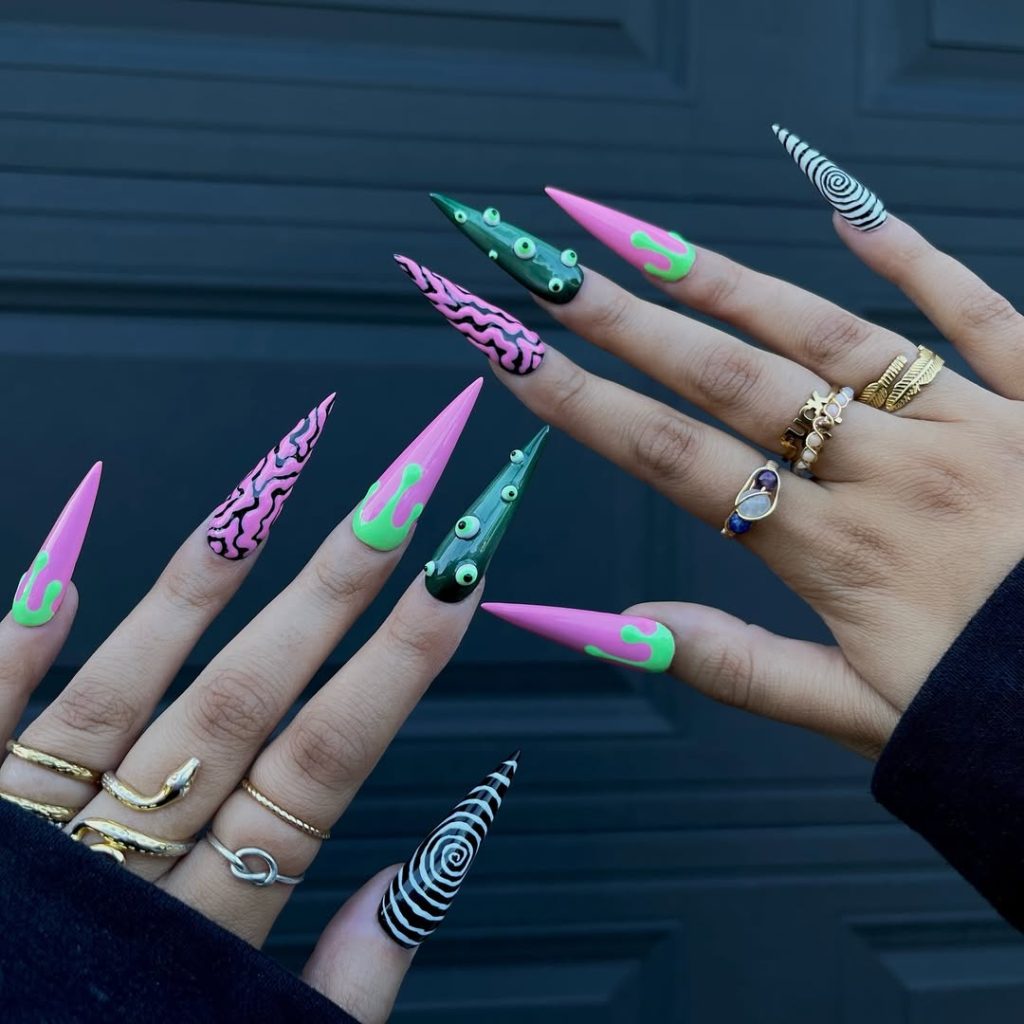 These hot pink and green stiletto nails bring an electrifying twist to playful chaos. With slime drips, abstract lines, and 3D googly eyes, this design feels like a wild dream come true. It’s vibrant, weirdly cute, and perfect for Halloween or any day you want your nails to turn heads.