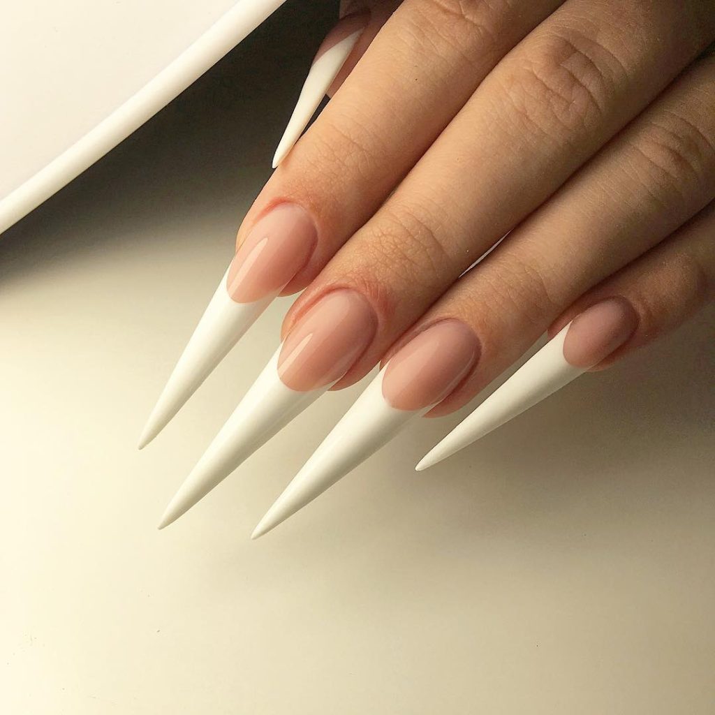 There’s something timeless about these white French stiletto nails—elegant, simple, and powerful in their precision. The nude base melts seamlessly into the sharp white tips, giving your hands an elongated, graceful appearance. It’s a modern classic for women who love clean, minimal designs that still pack a punch.