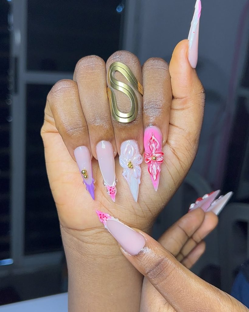 It’s a sassy, spring-inspired look that instantly cheers up your appearance. Ideal for any individual who loves feminine flair, these nails complement long shapes and look marvelous with flower dresses or gold jewelry. They’re perfect for summer-themed parties, weddings, or just when your manicure needs to say, “classy with a touch of fantasy.”