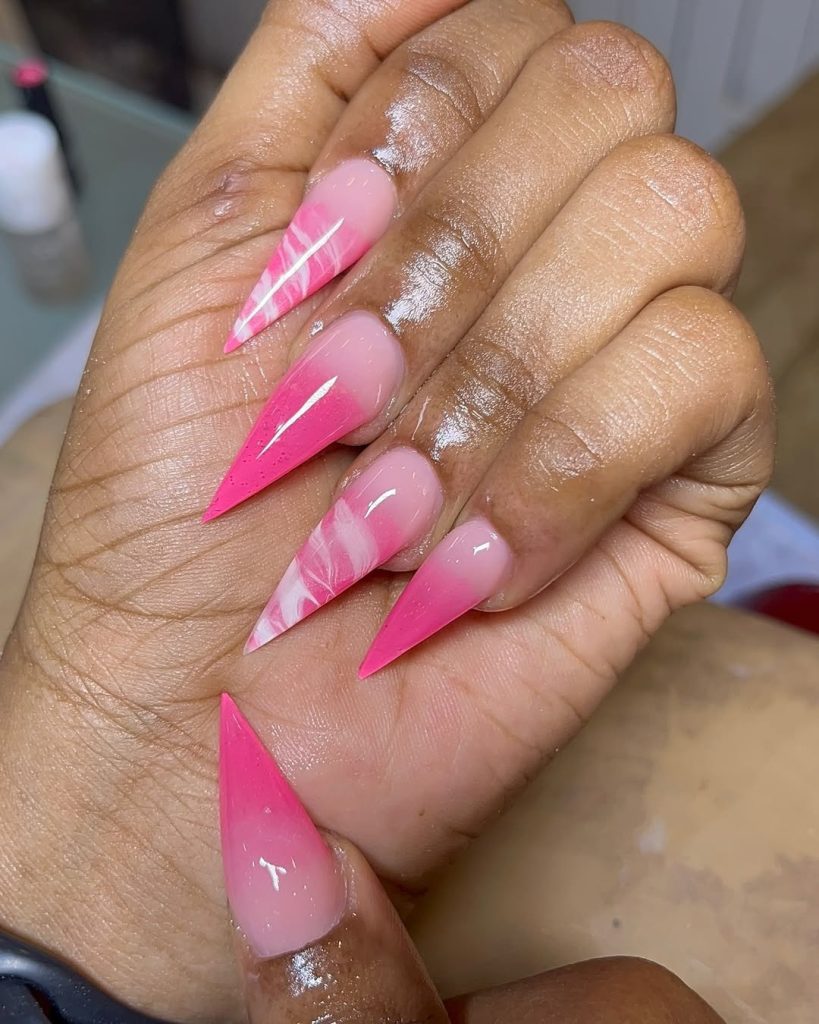 Sometimes, a minimalist approach really is best, as this pink stiletto ombré demonstrates. With a new pastel nude giving way to fiery pink, coupled with a marble curl on a single nail, the look is trendy and feminine but also easy-breezy, making it a go-to nail concept that will never look overplayed.