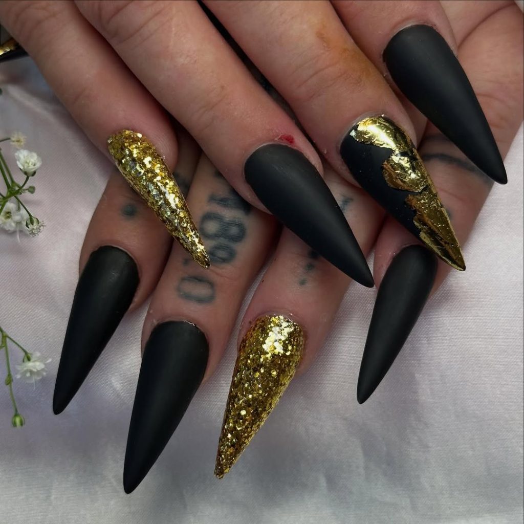 Drama, glamour, and edge combine in this dramatic black and gold stiletto design. The matte black nail provides a moody background, but gold glitter and foiled accents pack a drama punch. This is a manicure that will instantly make you look powerful and unstoppable.