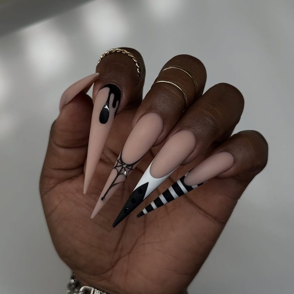 It’s a fun combination of scary yet chic for these Halloween nails. With spiderwebs, black drips, stripes, and a nude matte finish, they look like they belong in a Tim Burton film but with a sleek, high-fashion look. They’re dramatic yet fun—a great look for October but hip enough for any day you want to make a statement.