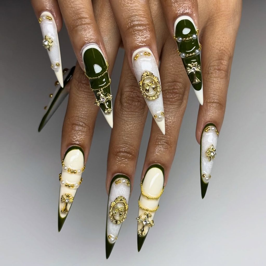 One might say that if luxury had a nail design, it would look just like this. With rich green, creamy white, and adornments in rich gold, these nails resemble pieces of tiny, shimmering jewels. With 3D decorations and lavish details, they stand out as true luxury, with a royal quality that leans both sophisticated and over-the-top.