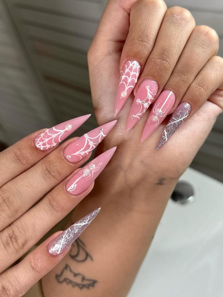 Why must spiderweb nails be dark, though? This cute, playful pink stiletto set turns the frightful theme on its head. With delicate white spiderwebs, minuscule pearl accents, and a sprinkle of glitter, the nails strike a lovely balance between sassy and adorable. It’s Halloween redefined in pastel hues.