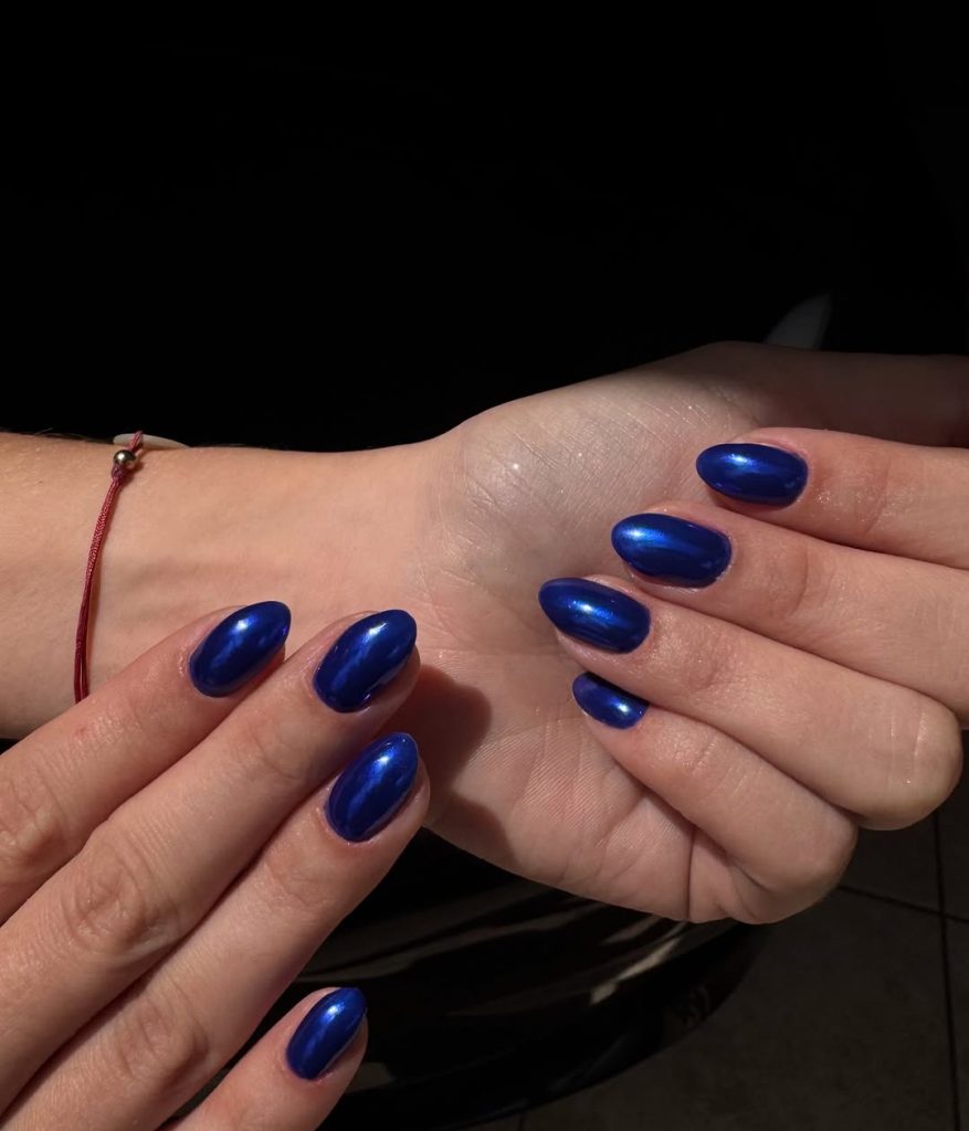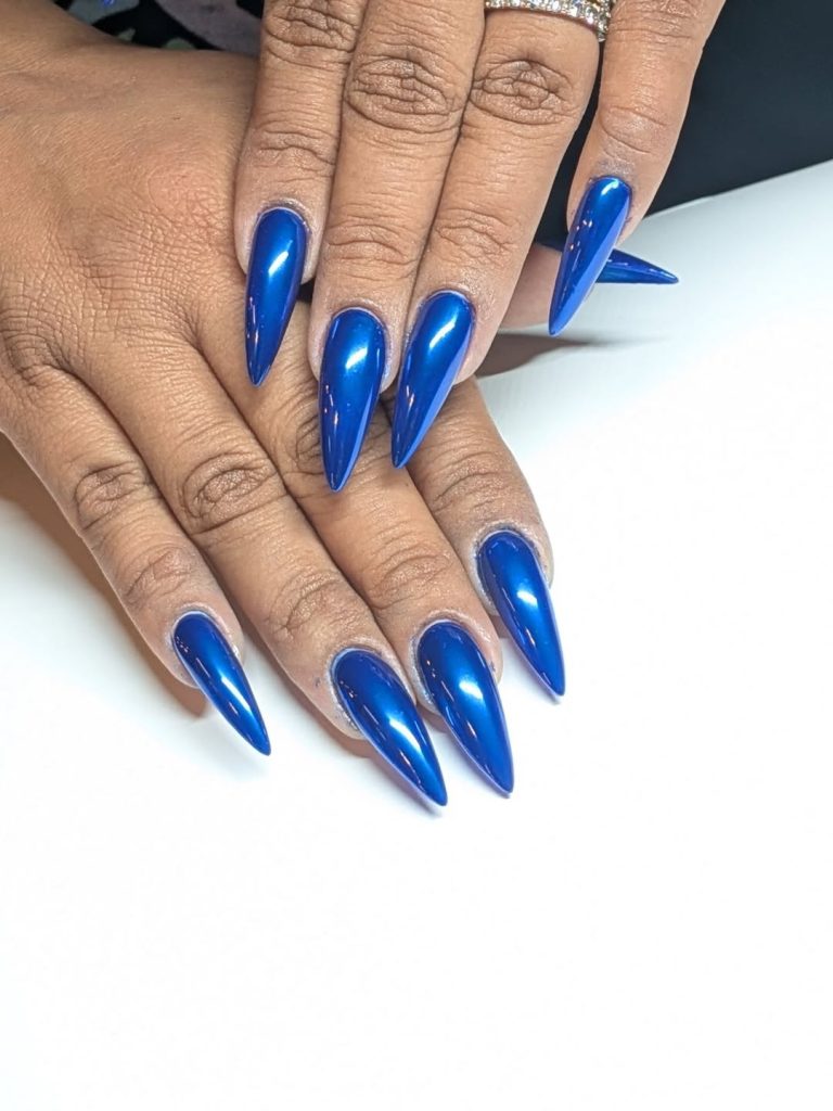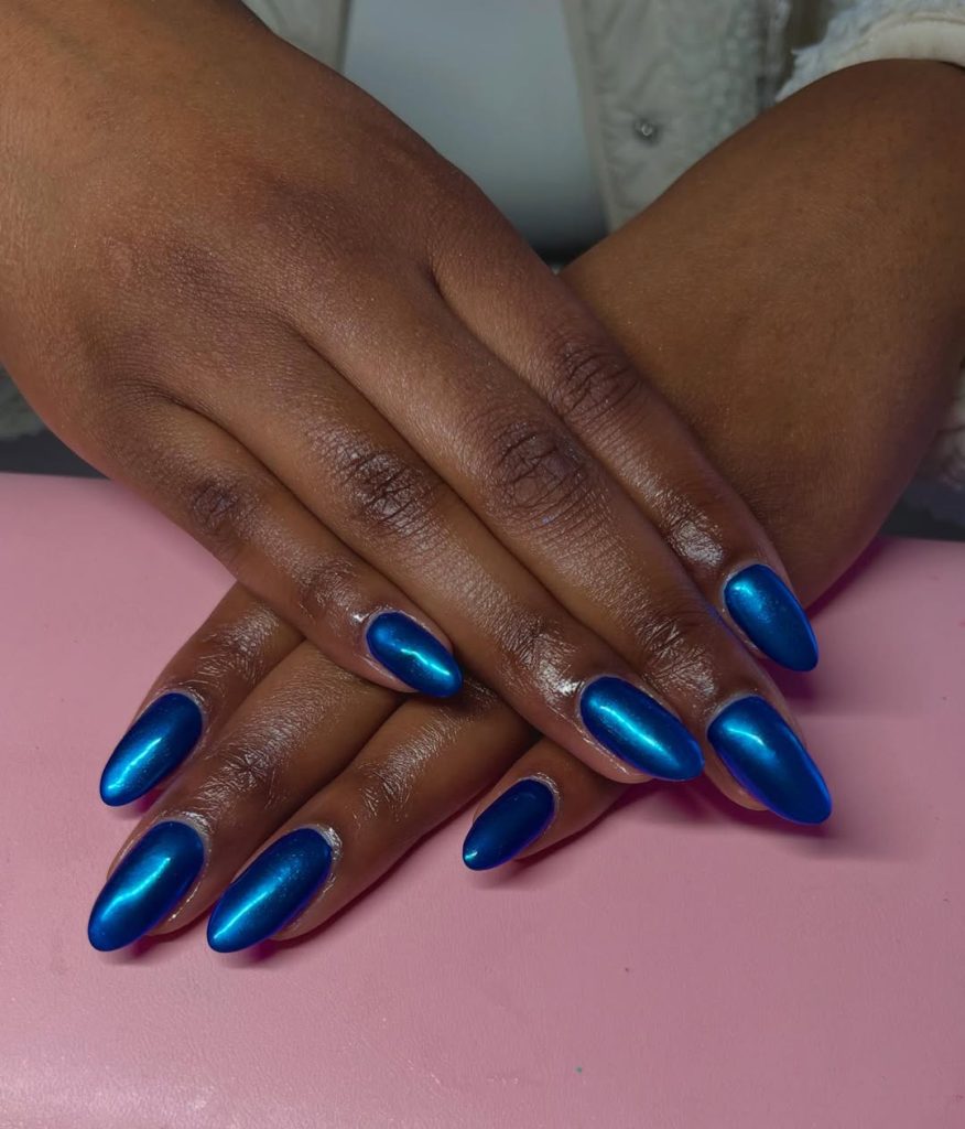 Bright and bold, these royal blue chrome nails shine like liquid metal. The oval shape softens the intensity, giving them a feminine edge while letting the color take center stage. They radiate confidence and fun — nails that are impossible to ignore in any setting.