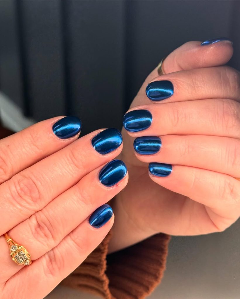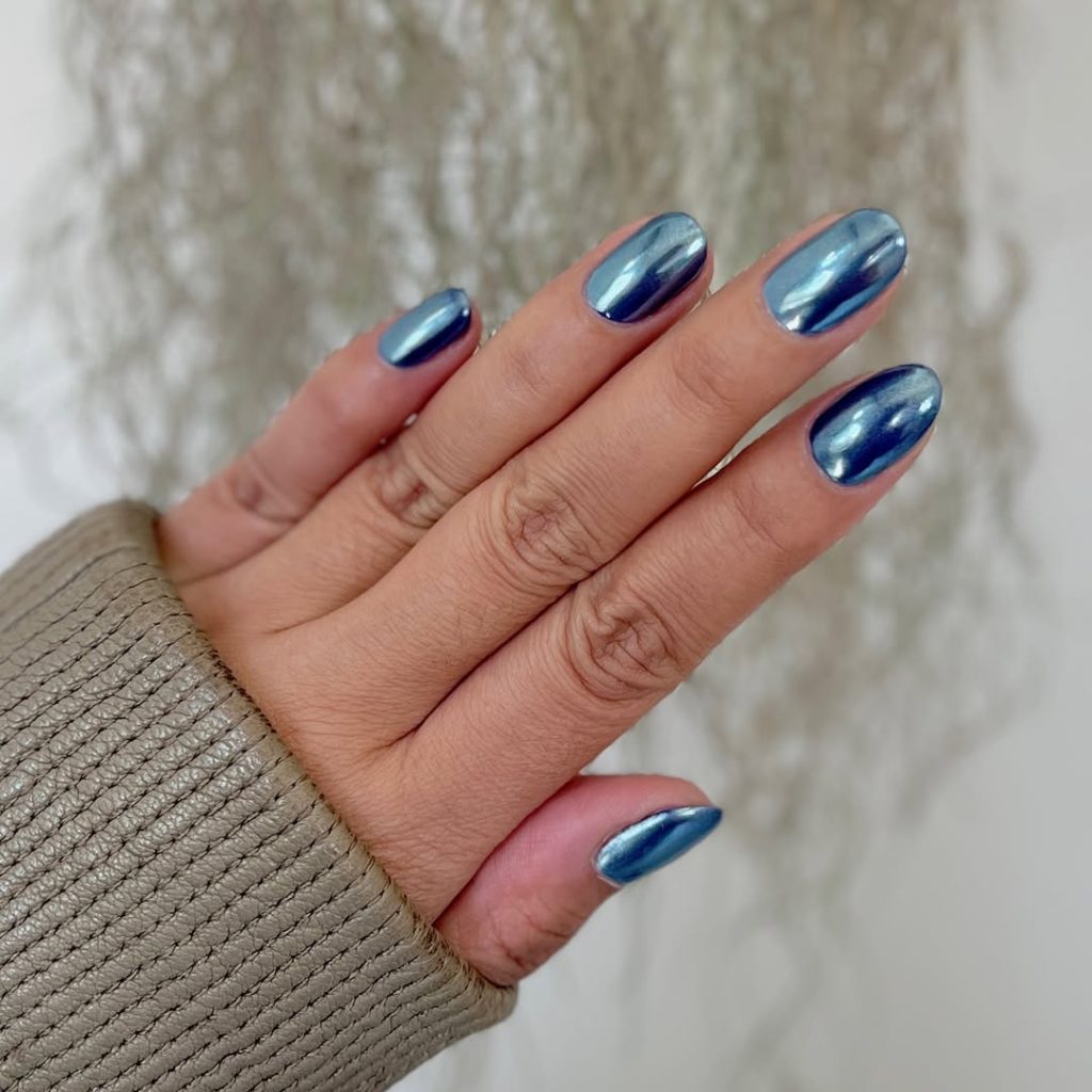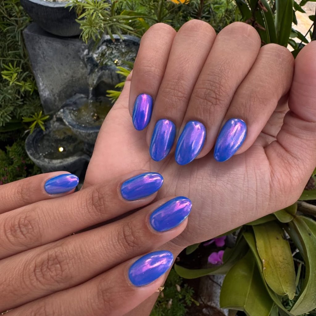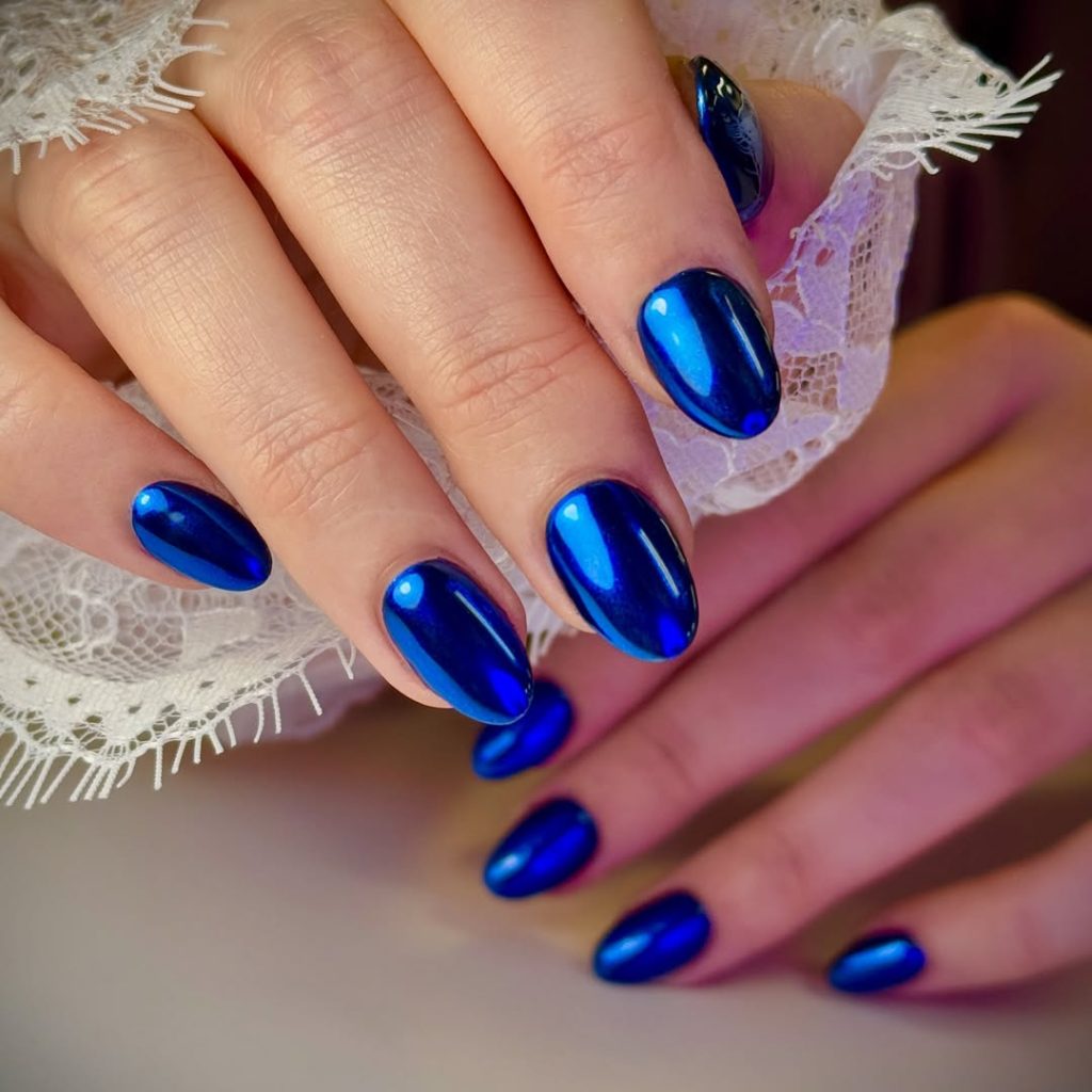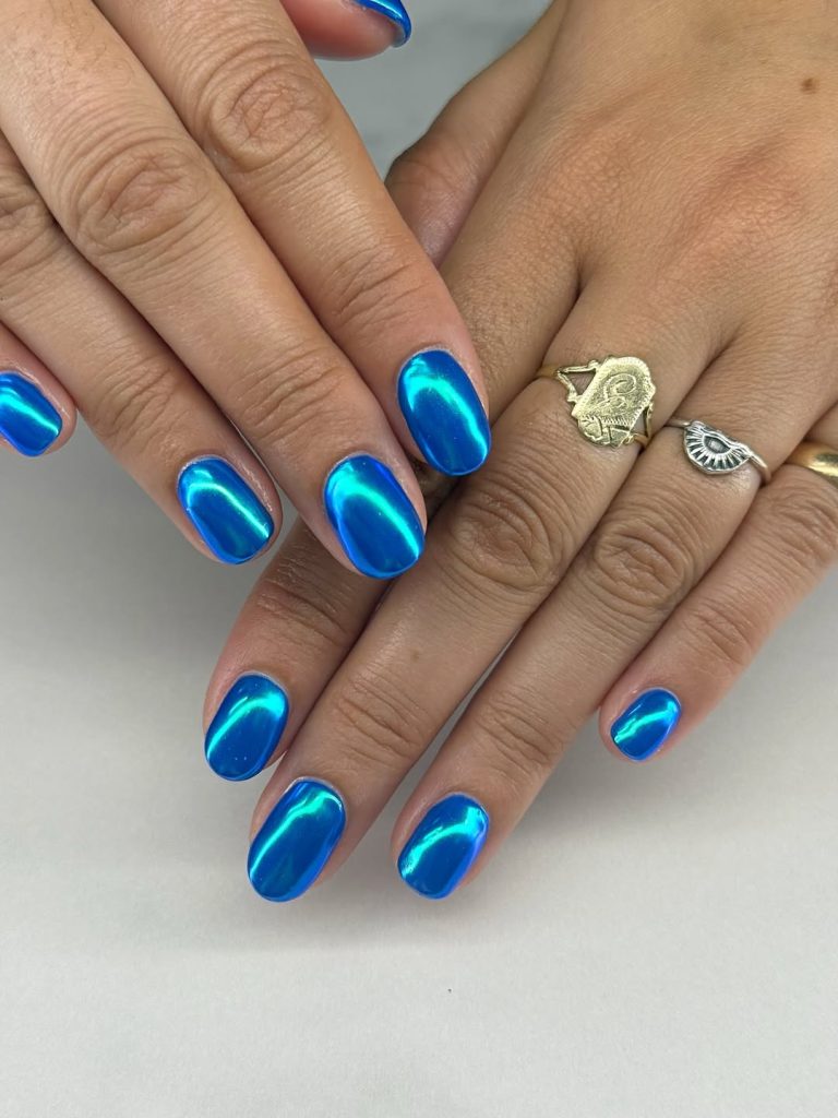 If you love bold colors but prefer practical lengths, these bright electric blue chrome nails are your answer. The short oval shape makes them easy to wear while the high-shine finish delivers all the impact of longer designs. They radiate energy and confidence without being over the top — a manicure that’s equal parts fun and wearable.