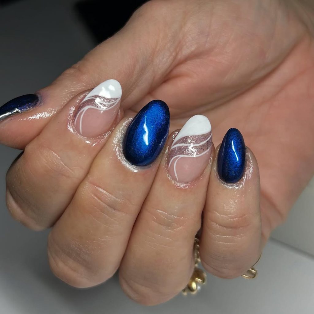 This design mixes the elegance of a classic french tip with the drama of deep blue chrome. The swirl of white and shimmering accents adds movement, while the bold chrome nails anchor the whole look. It’s chic, artistic, and a little playful — the kind of manicure that feels modern without losing that timeless polish.