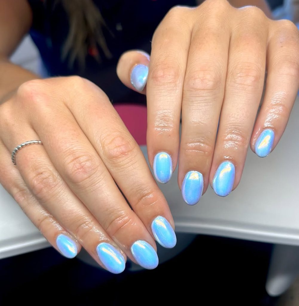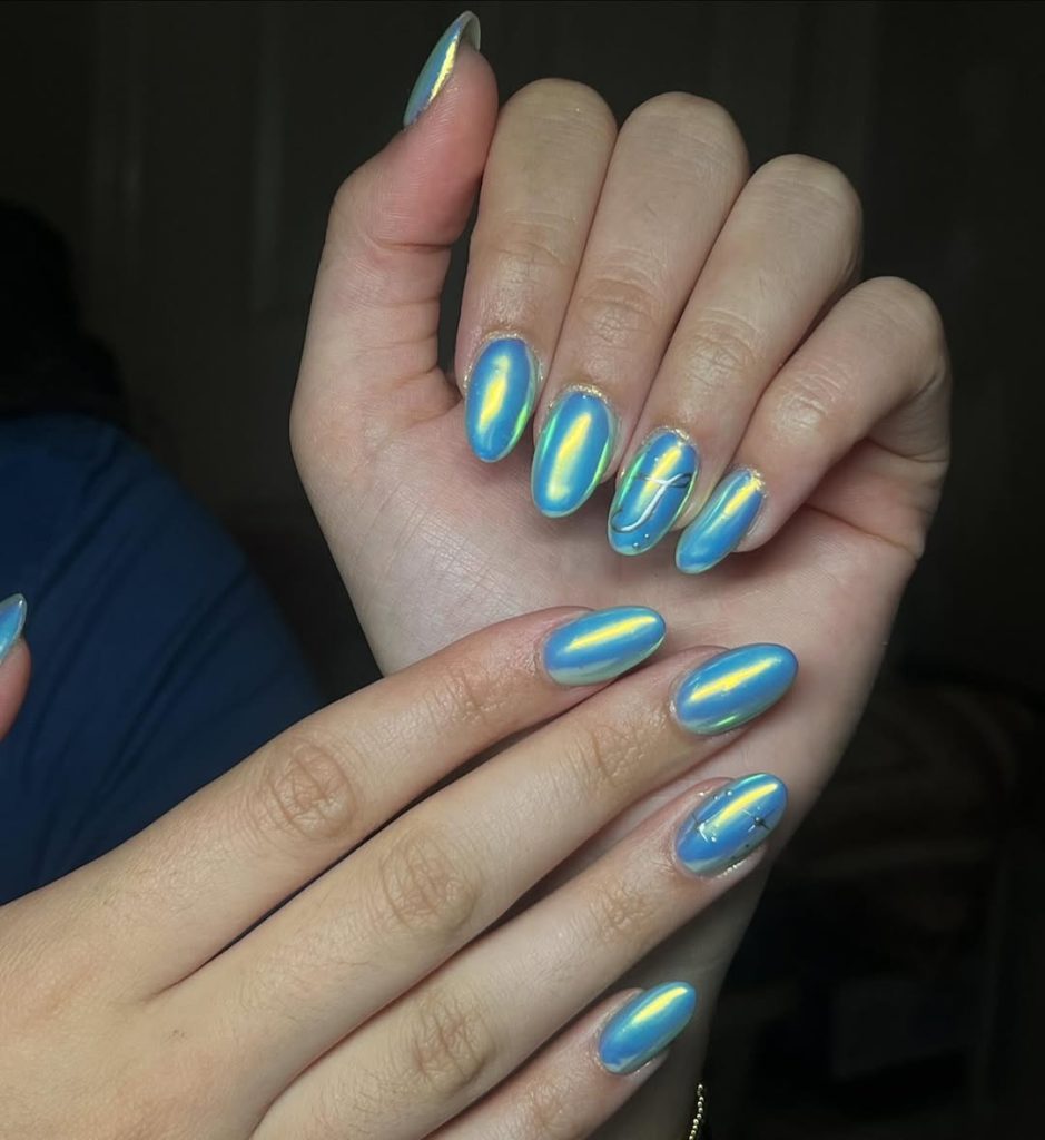 These nails are playful and eye-catching, with a base of blue chrome that reflects hints of pink and purple in the light. The result is almost holographic, giving the manicure a magical, multi-dimensional look. It’s fresh, fun, and full of personality.