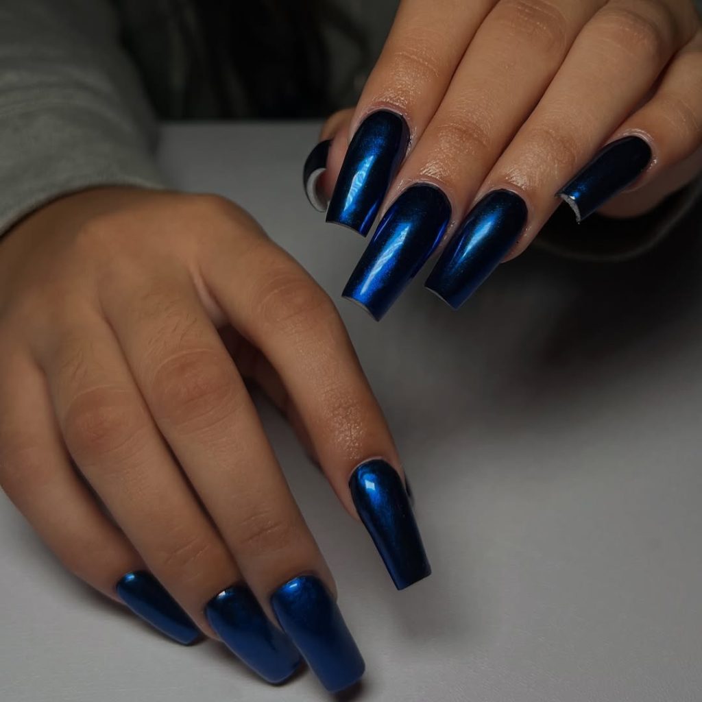 Long, bold, and unapologetic — these dark blue chrome coffin nails are pure drama. The reflective finish adds depth and mystery, while the squared-off coffin shape makes them edgy and fashion-forward. They’re nails that command attention, perfect for when you want to feel fearless and glamorous.