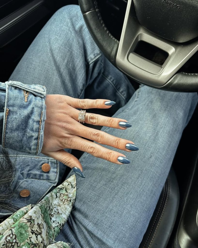 Almond shapes like this are universally flattering and practical for everyday wear. The dusty chrome tone works well across seasons, making it a versatile pick whether you’re dressing up or down. It’s a manicure that quietly elevates your look without demanding too much attention.