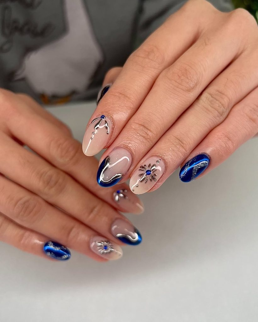 This set combines the clean sophistication of nude polish with the intensity of blue chrome, topped off with intricate floral-inspired art and gems. The design is playful yet polished, giving the impression of jewelry embedded into the nails. It’s detailed, feminine, and one-of-a-kind.