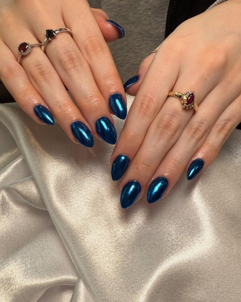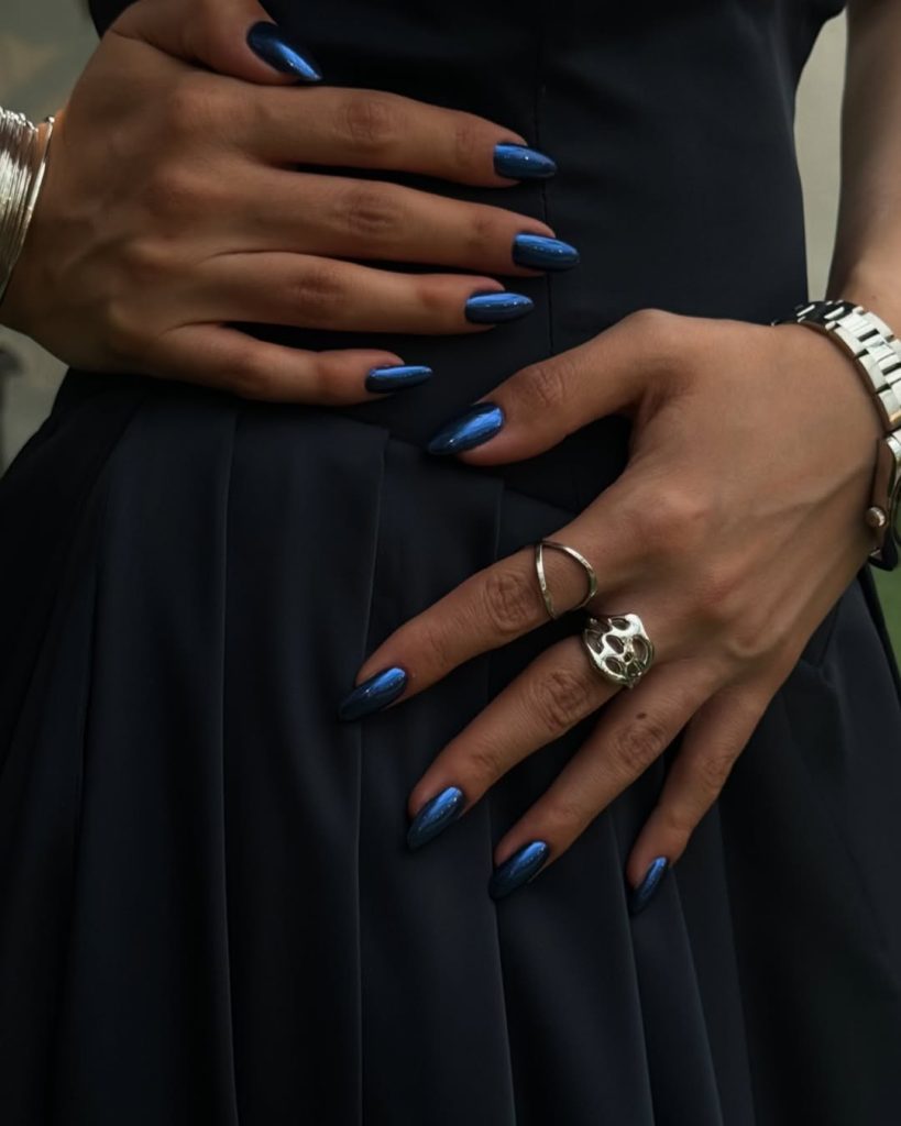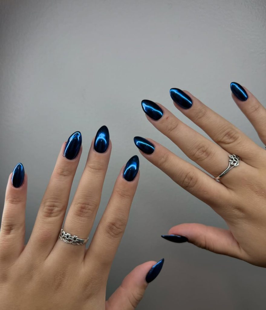Moody and chic, these dark chrome blue almond nails bring subtle sophistication with a slightly mysterious edge. Their reflective finish glimmers just enough to feel polished while keeping the overall look understated and elegant. They’re perfect if you want a modern manicure that feels timeless and wearable.