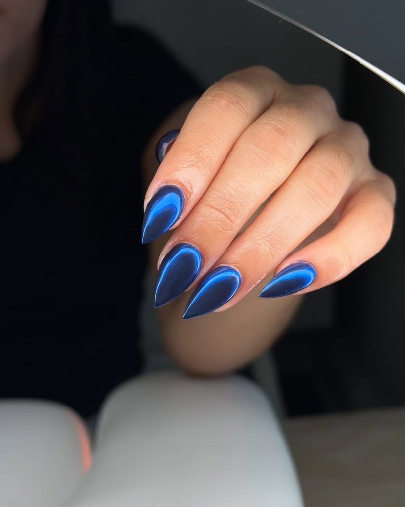 Fierce and magnetic, these dark electric blue stiletto nails look like they’re glowing under the light. The bold shade combined with the sharp tip creates a dramatic effect that’s both daring and stylish. It’s the kind of manicure that makes you feel instantly unstoppable.