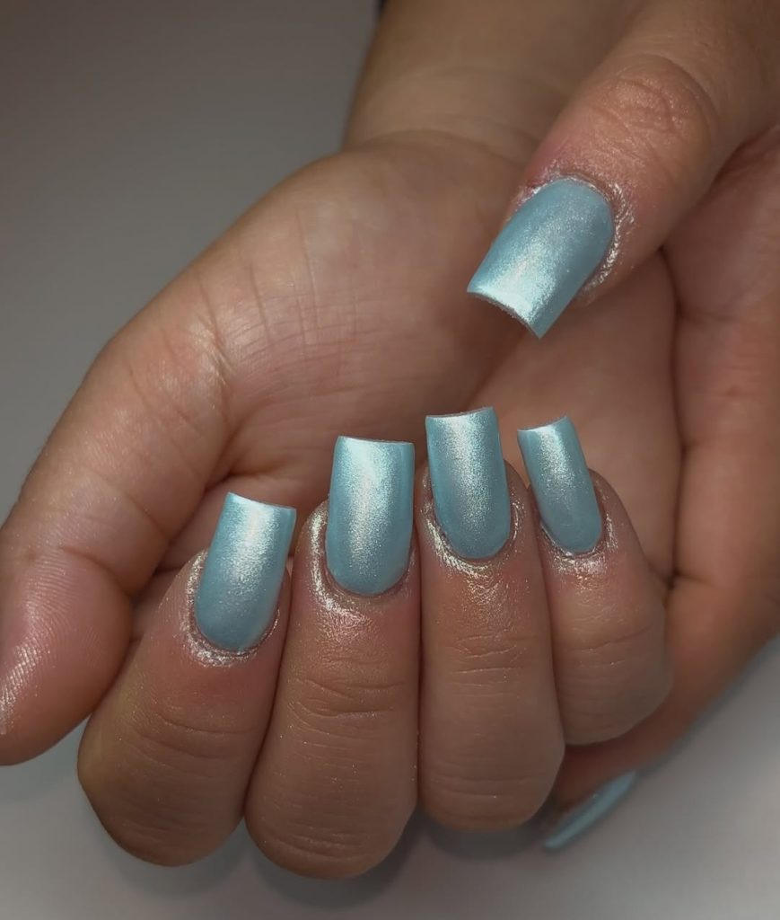Fresh and youthful, these light sky blue chrome nails give off an icy, luminous effect that feels almost magical. They shimmer in different lights, shifting between soft blue and frosty highlights. The effect is playful yet elegant, making them perfect for brightening up everyday outfits or vacations in the sun.
