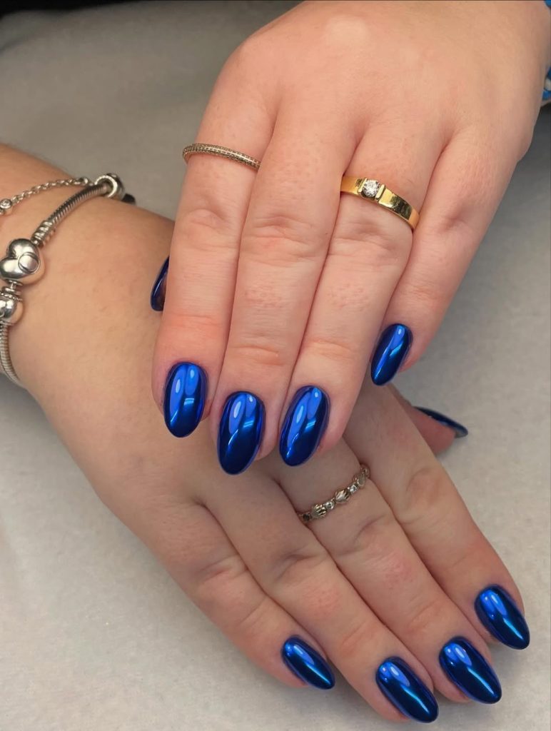 Oval nails like these are flattering for all hand shapes and lengths. The royal chrome shade is a statement on its own, making accessories optional. Perfect for anyone who loves to keep their manicure striking without extra embellishments.