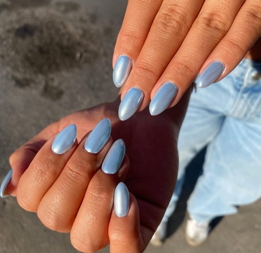 These pale blue chrome almond nails carry a soft glow that feels airy and modern. They reflect the light beautifully, adding just enough shimmer to feel fresh while keeping a delicate, feminine energy. Perfect for sunny days and casual looks, they bring an understated charm.