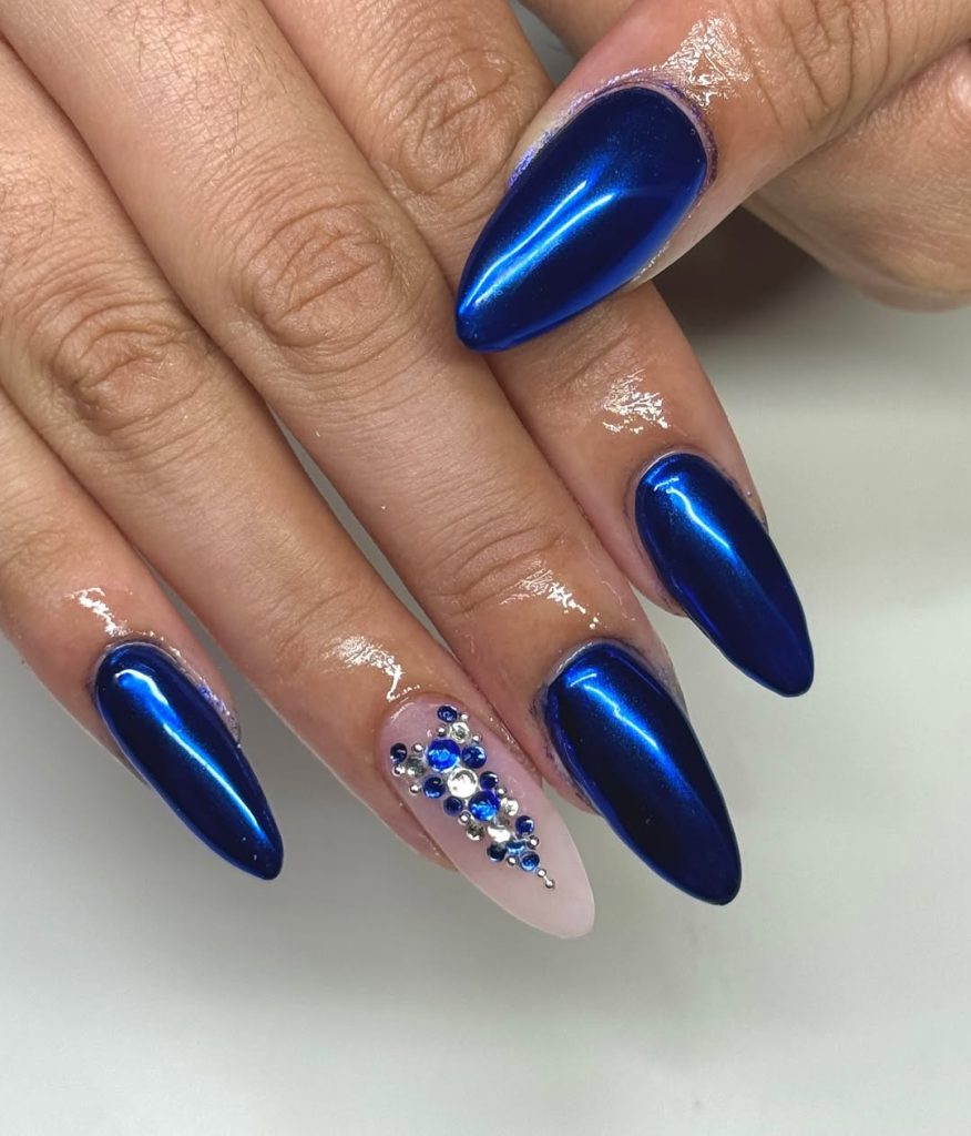 A bold royal blue chrome manicure gets an instant upgrade with a crystal-studded accent nail. The glossy finish radiates depth, while the jeweled detailing adds a touch of glamour and personality. It’s the kind of look that transforms a simple manicure into a statement piece, like wearing jewelry at your fingertips.
