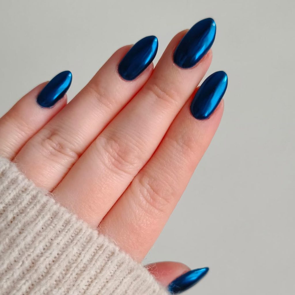 There’s something timeless about royal blue chrome in a simple oval shape. The high-shine finish makes these nails look like liquid metal, bold but elegant. They radiate confidence and sophistication, making them perfect for both everyday wear and special occasions.