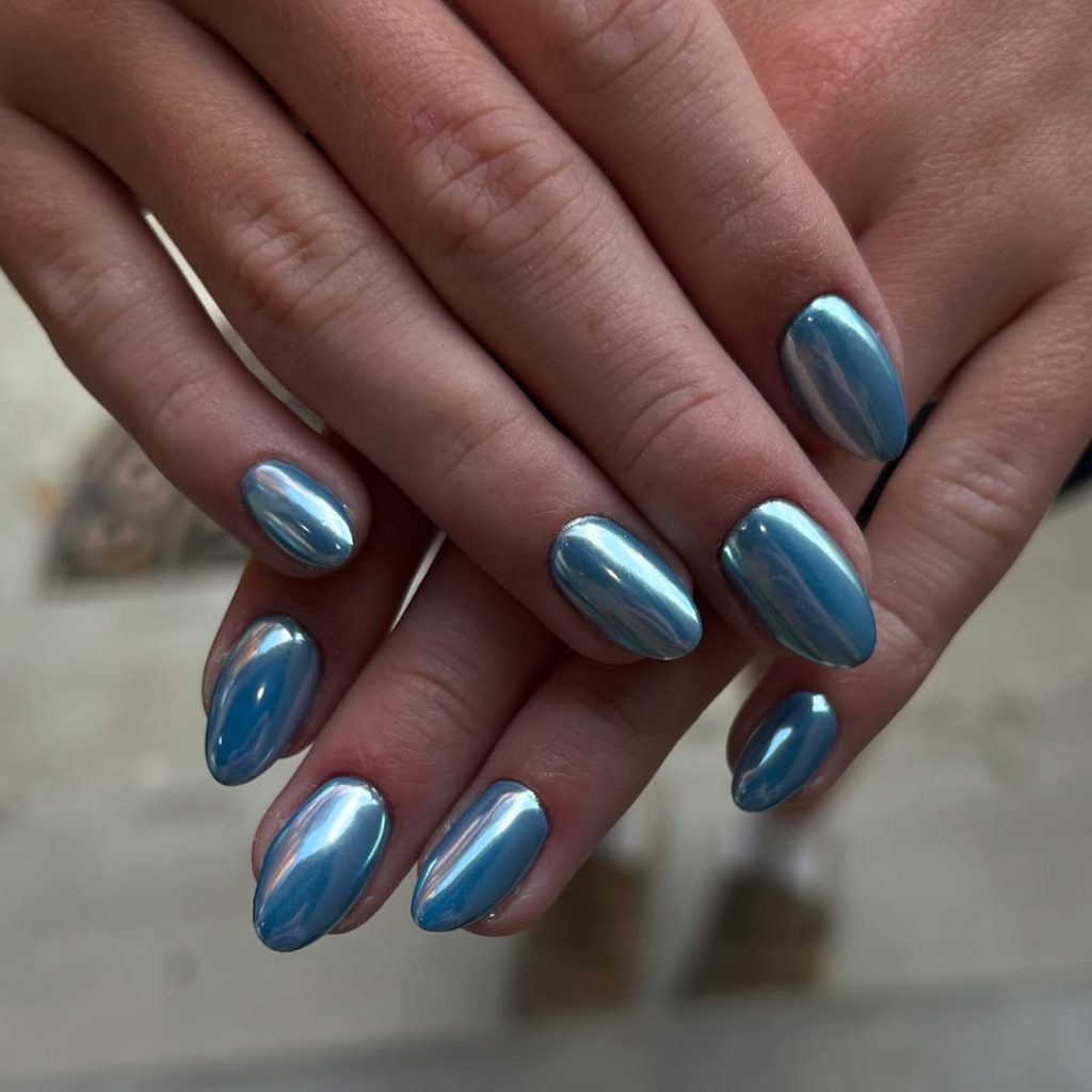 There’s something effortlessly cool about dusty blue chrome nails in an oval shape. The subtle, mirrored shine feels polished but not overly flashy, giving them a refined edge that blends with everyday style. They radiate confidence in a laid-back, understated way — like wearing a favorite denim jacket but in nail form.