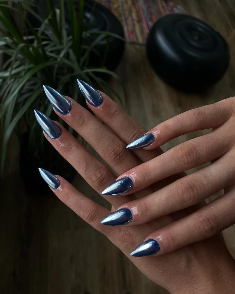 There’s something undeniably fierce about electric blue chrome when it’s paired with long stiletto tips. The reflective shine gives off a bold, powerful energy — almost like liquid metal wrapped around each fingertip. These nails don’t whisper style, they scream it, and they’re the kind of look that instantly makes you feel unstoppable at a dinner party or night out.