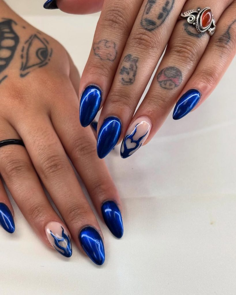 7. Navy Blue Chrome Almond Nails with Art Accents