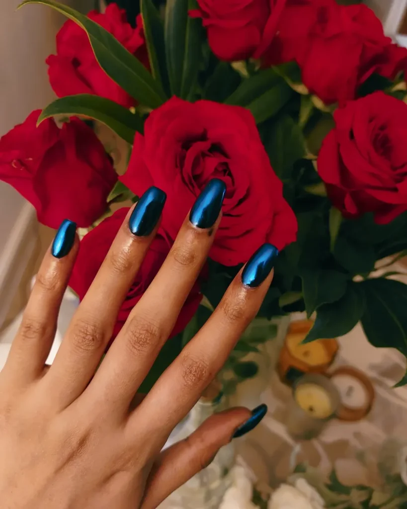 Strong, chic, and powerful — these royal chrome square nails are a showstopper. The flat tip adds structure while the reflective chrome surface glows like a midnight sky. Paired against red roses, the effect is intensely romantic and elegant, making this look feel like a classic Hollywood moment with a modern metallic twist.