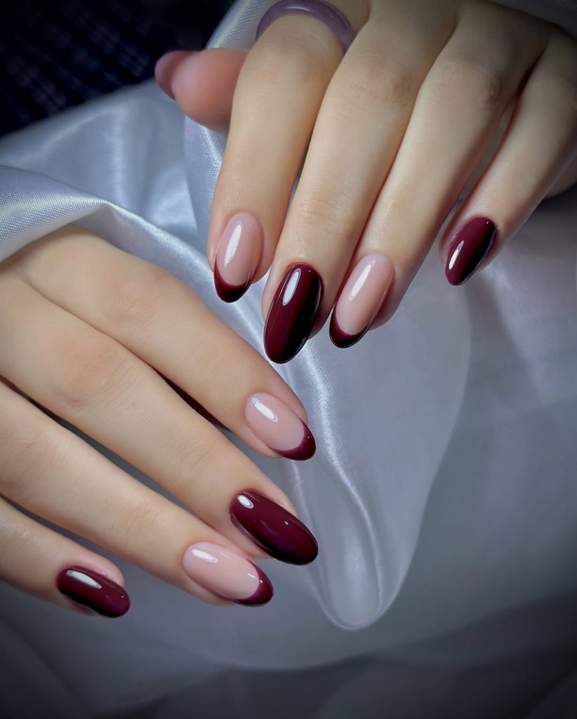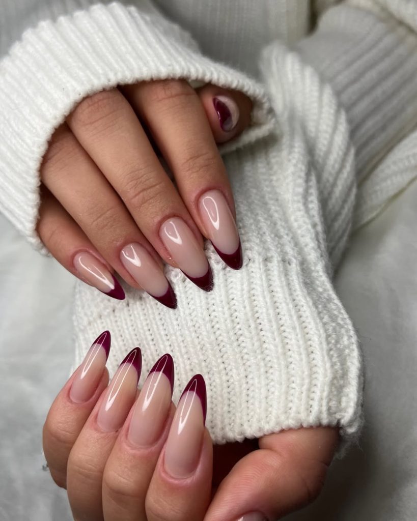 18. Cherry-red almond nails with soft French contrast