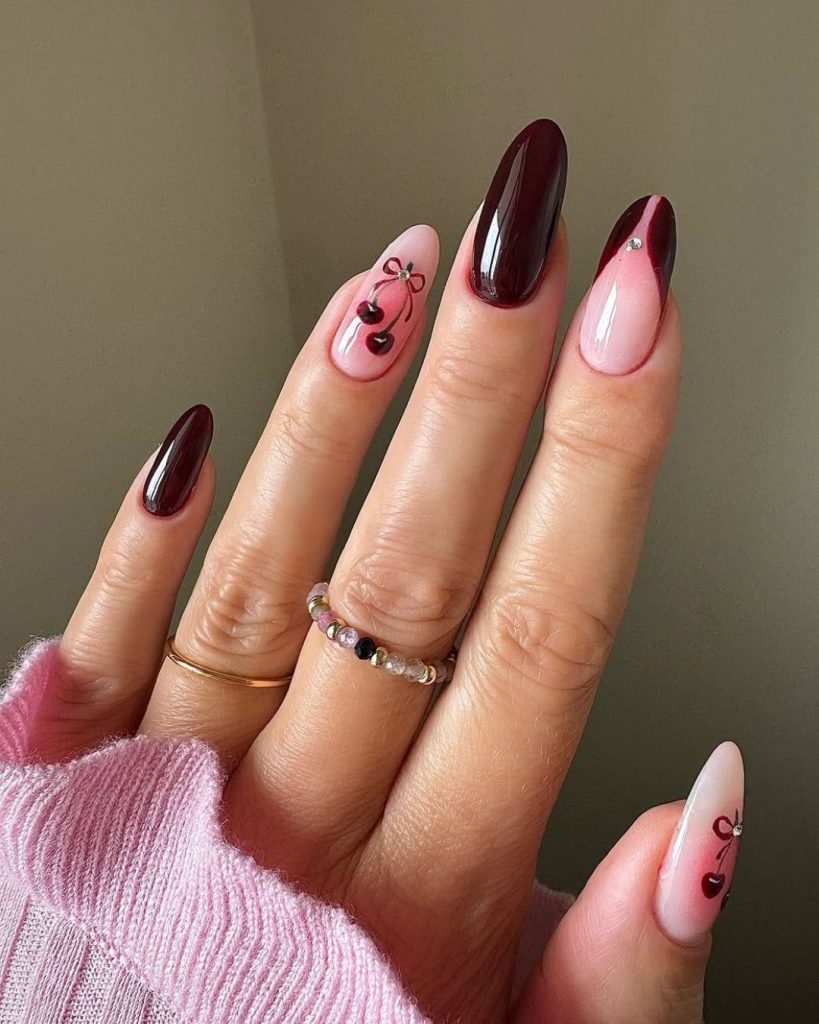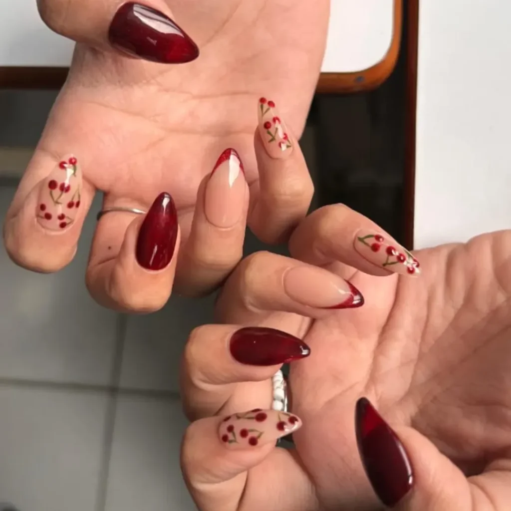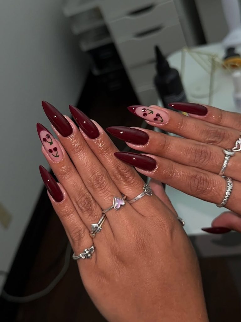 16. Cherry-red almond nails with delicate cherry art