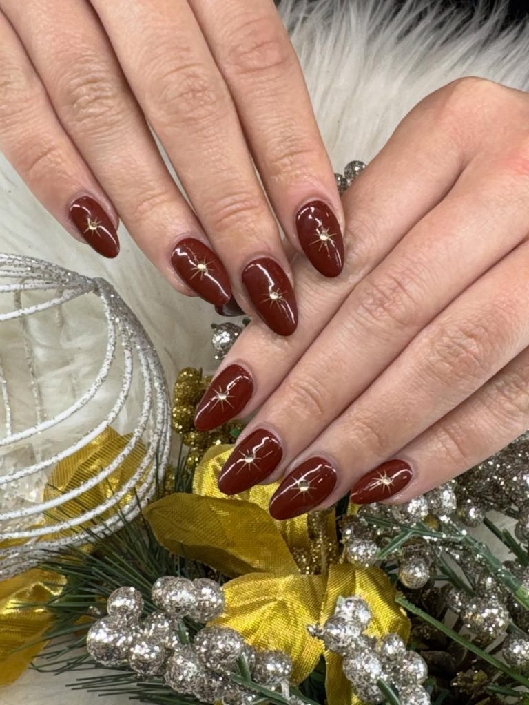This manicure feels cozy, festive, and just a little magical. The warm cherry red shade has a softer, almost spiced tone, while the tiny gold star accents add a subtle twinkle. It’s the kind of design that makes you smile when you notice the details—charming without trying too hard.